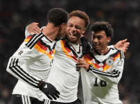독일 축구대표팀의 아산 웨드라오고(가운데)가 18일(한국시간) 열린 슬로바키아와의 2026 북중미월드컵 유럽예선 A조 6차전에서 득점한 뒤 좋아하고 있다. 라이프치히/AP 연합뉴스