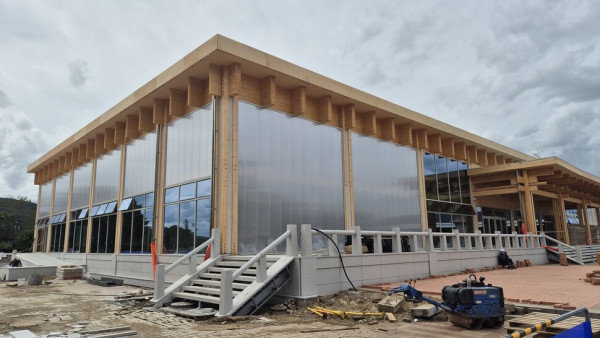 22일 오전 경북 경주시 인왕동 국립경주박물관의 남쪽 중정을 완전히 가리던 공사장 가림막이 사라졌다. 어른 허리춤까지 오는 낮은 울타리 너머 막바지 공사가 한창인 건물이 모습을 드러냈다. 나무 기둥 사이 벽면에 유리창이 채워지고 문틀도 설치됐다. 건물 앞에는 새 보도블록을 설치하는 작업이 이어졌다. 이 건물의 공정률은 95% 수준으로 계획대로면 다음주 중 공사가 마무리된다.